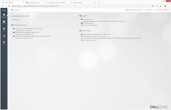 设备部署完成之后,管理员将进入VxRail Manager主画面。系统将自动转到仪表板,其中会显示系统整体运行状态、支持、VxRail社区和事件历史等信息。左边是若干个选项卡,其中包括:仪表板、支持、事件、运行状态和配置。