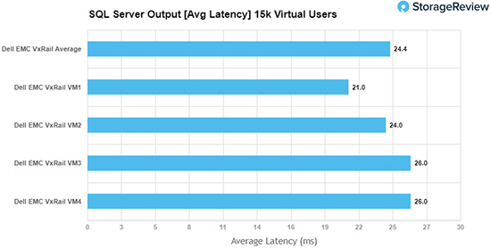 有关SQL Server性能的一个更明显标志是延迟。在SQL Server平均延迟方面,P570F总分为24.4ms,单个虚拟机在21ms至26ms之间。
