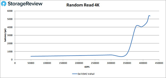在4K随机读取测试中,VxRail在350,000 IOPS之前都维持亚毫秒级延迟性能,随后性能峰值达到422,052 IOPS,延迟为5.38ms。