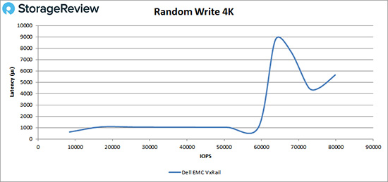 在4K随机写入测试中,VxRail在大约17,000 IOPS时延迟就超过1ms了,随后沿着1ms线一直到了60,000多IOPS,性能峰值达到了79,801 IOPS,期间延迟为5.64ms。