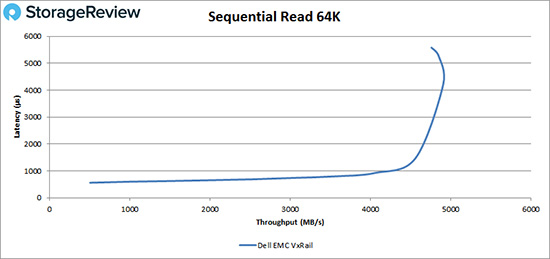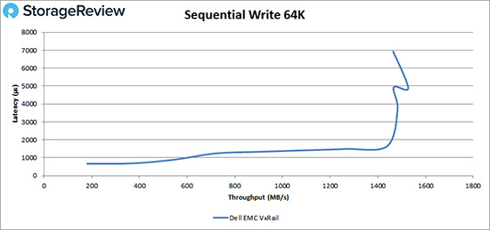 在64K顺序写入测试中,VxRail运行延迟在1ms以下, 一直持续到大约10,000 IOPS或600MB/s,峰值性能约为25,000 IOPS或1.53GB/s,延迟在少量回落前为4.9ms。