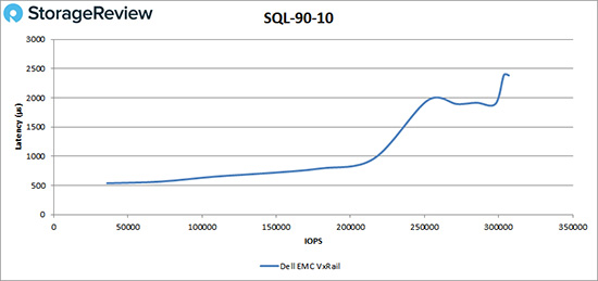 在SQL 90-10工作负载测试中,VxRail在215,000 IOPS之前延迟都低于1ms,性能峰值为306,851 IOPS,期间延迟为2.4ms。