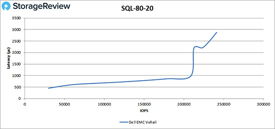 在SQL 80-20工作负载测试中,VxRail在209,000 IOPS以内都保持亚毫秒级延迟,性能峰值为240,468 IOPS,期间延迟为2.9ms。
