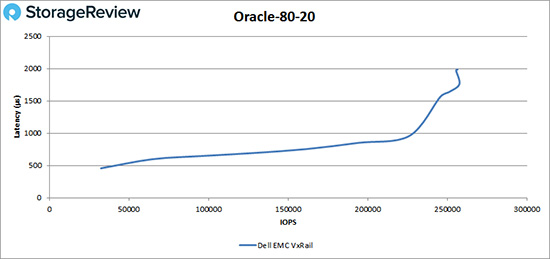 在Oracle 80-20工作负载测试中,VxRail在226,000 IOPS之前都拥有亚毫秒延迟性能,随后达到性能峰值,约为258,000 IOPS,延迟为1.76ms。