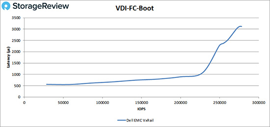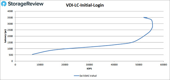 在VDI链接克隆初始登入测试中,VxRail在大约20,000 IOPS之前都维持亚毫秒级延迟,然后达到性能峰值,大约为56,000 IOPS,在性能下降之前延迟为3ms。