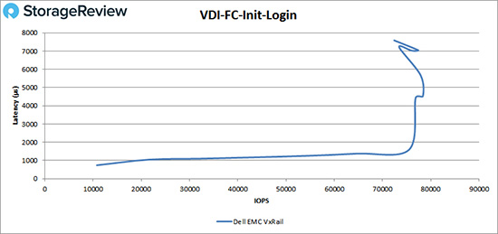 在VDI完整克隆初始登入测试中,VxRail延迟很快就突破了1ms,然后达到性能峰值,大约为78,000 IOPS,在延迟出现一定下降之前延迟为4.5ms。