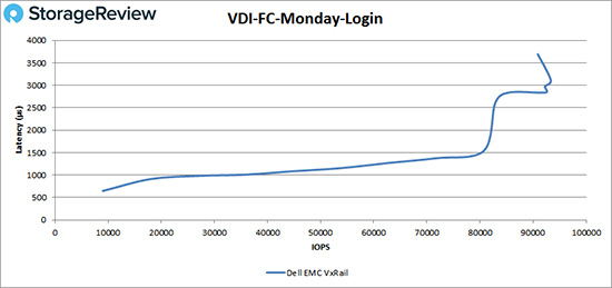 在VDI完整克隆周一登入测试中,VxRail在性能达到20,000 IOPS之前都维持亚毫秒延迟,然后达到性能峰值,大约为93,000 IOPS,在性能稍微下降之前延迟为3.1ms。