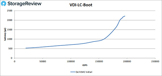 在VDI链接克隆开机测试中,VxRail在性能达到159,000 IOPS之前,延迟都低于1ms,然后达到性能峰值195,062 IOPS,期间延迟为2.2ms。