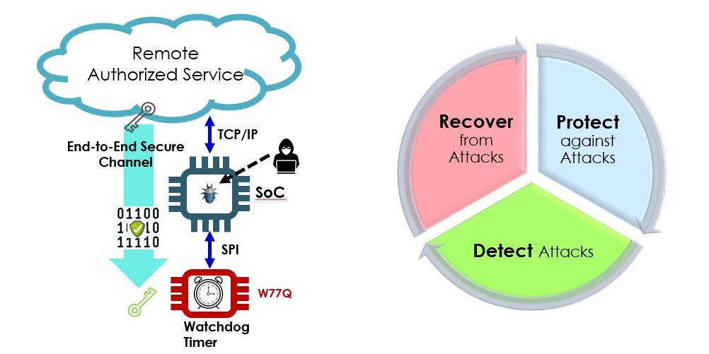• 安全程序代码更新,包括通过更新授权单位与W77Q之间的端对端加密通道执行无线更新,甚至在主机MCU或SoC遭到入侵的情况下也能进行;