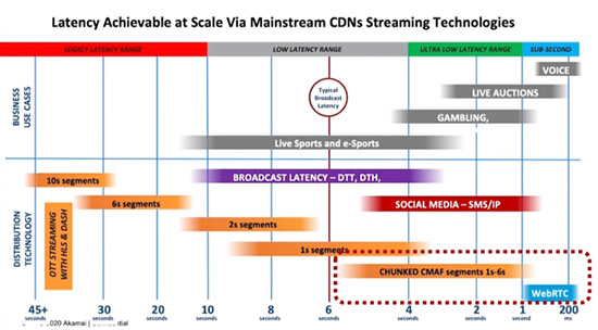 卡顿是影响视频直播体验的重要因素,而对于直播电商来说,流畅的观看体验更是吸引顾客的重要法宝。目前来看,传统视频直播的延时会达到30秒左右,而2019年美国超级碗各大OTT直播平台统计的平均延时为28秒 。在未来的3至5年时间内,视频直播会更多采用DASH-LL和LL-HLS协议,而其封装框架是CMAF协议,最终视频的延时将缩短至2到10秒 。社交媒体、电商类直播因包含打赏、送礼物、提问、连线PK等多种互动场景,因此要求延时控制在6秒内,而CMAF完全可以满足这种需求。作为一个标准化容器,CMAF可同时容纳视频和音频文件,且不会对现有编码格式进行任何改变。另外,它还可以同时储存多种协议的播放列表,大大降低编码和存储成本、提高CDN的缓存效率,从而降低延时。根据Akamai今年的调研数据,目前市面上包括移动设备、平板电脑、电视终端等97%的设备都支持CMAF,且诸如Chrome、Edge、Firefox、IE、Safari等100%的主流浏览器也支持CMAF。但在直播电商环境中,Akamai并不建议一味追求减小延时,因为延时减小意味着缓冲量减小,这会导致视频卡顿的问题凸显。所以,直播电商要根据业务的需求来平衡延时和缓冲之间的关系。