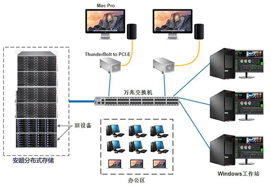 从系统结构图中可见,安超分布工存储系统由新的四个存储节点以及两台旧设备共同组件,通过万兆交换机与多台Windows工作站,Mac工作站以及办公网络相连接。所有工作站与办公网络均可访问存储系统。