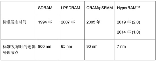 目前,许多 MCU 供货商正在开发效能更高、功耗更低的新一代 MCU,以满足市场需求。但从整体系统设计的角度来看,与 MCU 搭配使用的 DRAM 也需要有新的选择,以提供比现有 SDRAM、低功耗 SDRAM 和 CRAM/PSRAM 更佳的优势。因为这些现有的 DRAM 标准定义过于陈旧,已无法跟上最新技术发展(详情请参照表1)。