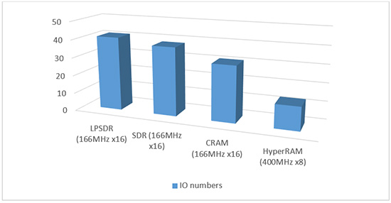 HyperRAMTM 仅具备 13 个信号 IO 脚位,可大大简化 PCB 的布局设计。这也意味着,在设计最终产品时,设计人员能将 MCU 的更多脚位用于其他目的,或减少 MCU 使用脚位以提升成本效益。如图 2 所示,与类似的 DRAM(如低功耗 DRAM、SDRAM 和 CRAM/PSRAM)相比,HyperRAMTM 只需最少的脚位数便能实现近似的处理量(333MB/s)。