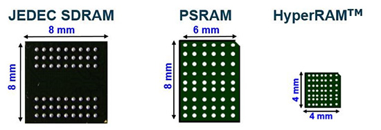 由于 HyperRAMTM 是近几年才开发的,因此它可以采用最新型的半导体制程节点和封装技术,使其封装尺寸比其他 DRAM 都要小。图 4 为 JEDEC、PSRAM 和 HyperRAMTM 的封装尺寸比较。