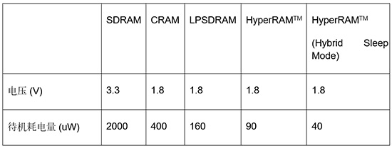更重要的是,HyperRAMTM 在混合休眠模式下的耗电量仅 45uW(1.8V 下),与 SDRAM 在待机模式下的耗电量有明显差异(表 2)。另一方面,即使采用低功耗的 SDRAM,其耗电量和外形尺寸仍较 HyperRAMTM 更大。