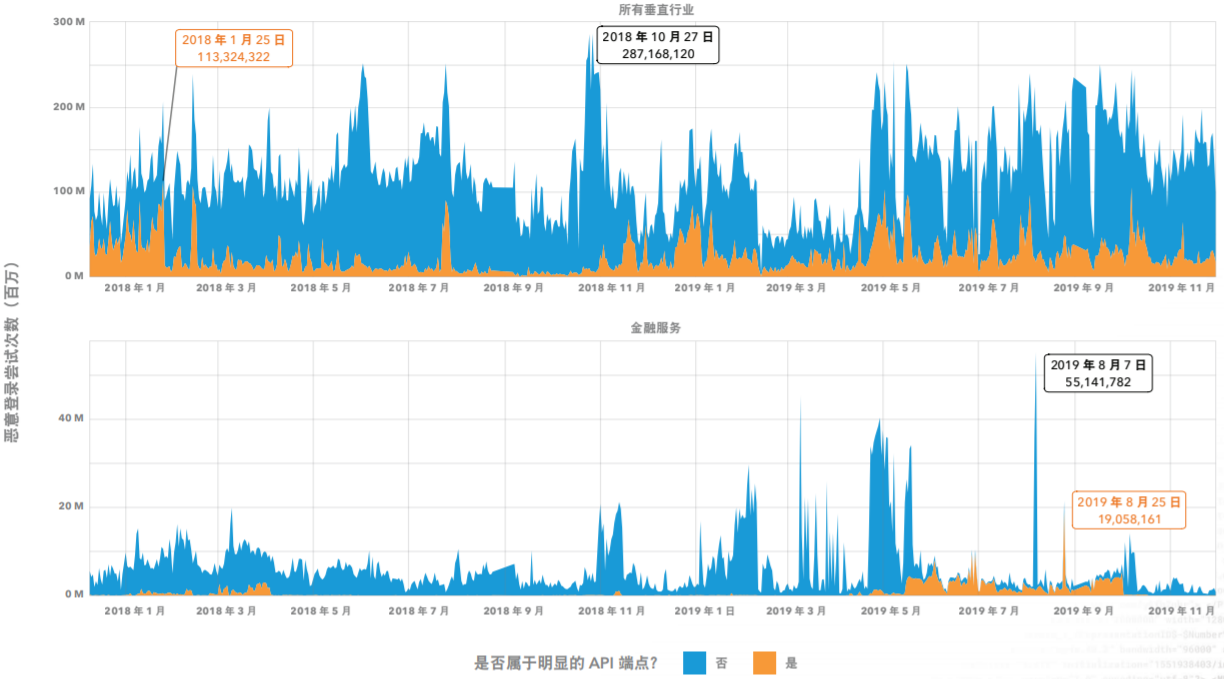 网络犯罪分子还会利用撞库非法访问API。根据Akamai《2020年互联网安全状况报告:金融服务——恶意接管尝试》,攻击者常常将提供保密数据和服务访问的REST和SOAP端点作为攻击目标,然后利用这些数据和服务实施金融犯罪。下图显示了Akamai在一年内发现的恶意登录尝试。橙色表示针对API端点的尝试。上半部分表示所有行业,下半部分表示金融服务领域 。