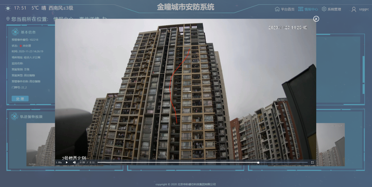 在后台,“金瞳”高空安防系统还可对高空抛物整个过程进行回溯。通过抛物点定位和抛物轨迹复现,“金瞳”能够协助办事人员第一时间找到肇事户主,同时为案件调查提供抛物关键时段原始录像佐证,在减轻追溯取证工作量的同时,保障人民群众生命财产的安全。