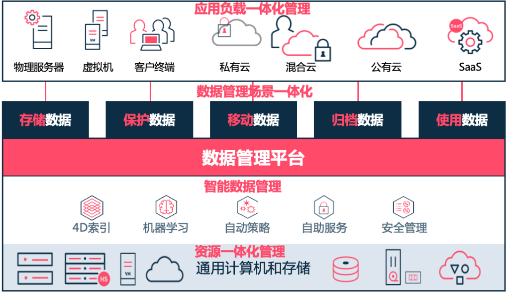 随着数据中心架构的发展成熟,底层资源结构逐步统一成兼容并收的大平台,能够消除信息孤岛,从而满足业务系统迅猛发展的各种需求。为了适应这种变化,数据管理软件厂商开始转向一体化数据管理平台,包括应用负载一体化管理、数据管理场景一体化以及资源管理一体化三大方面。通过这些一体化管理能力的集成,数据管理平台也逐步向多形态、多架构、精简管理、方便维护等方向稳步发展。