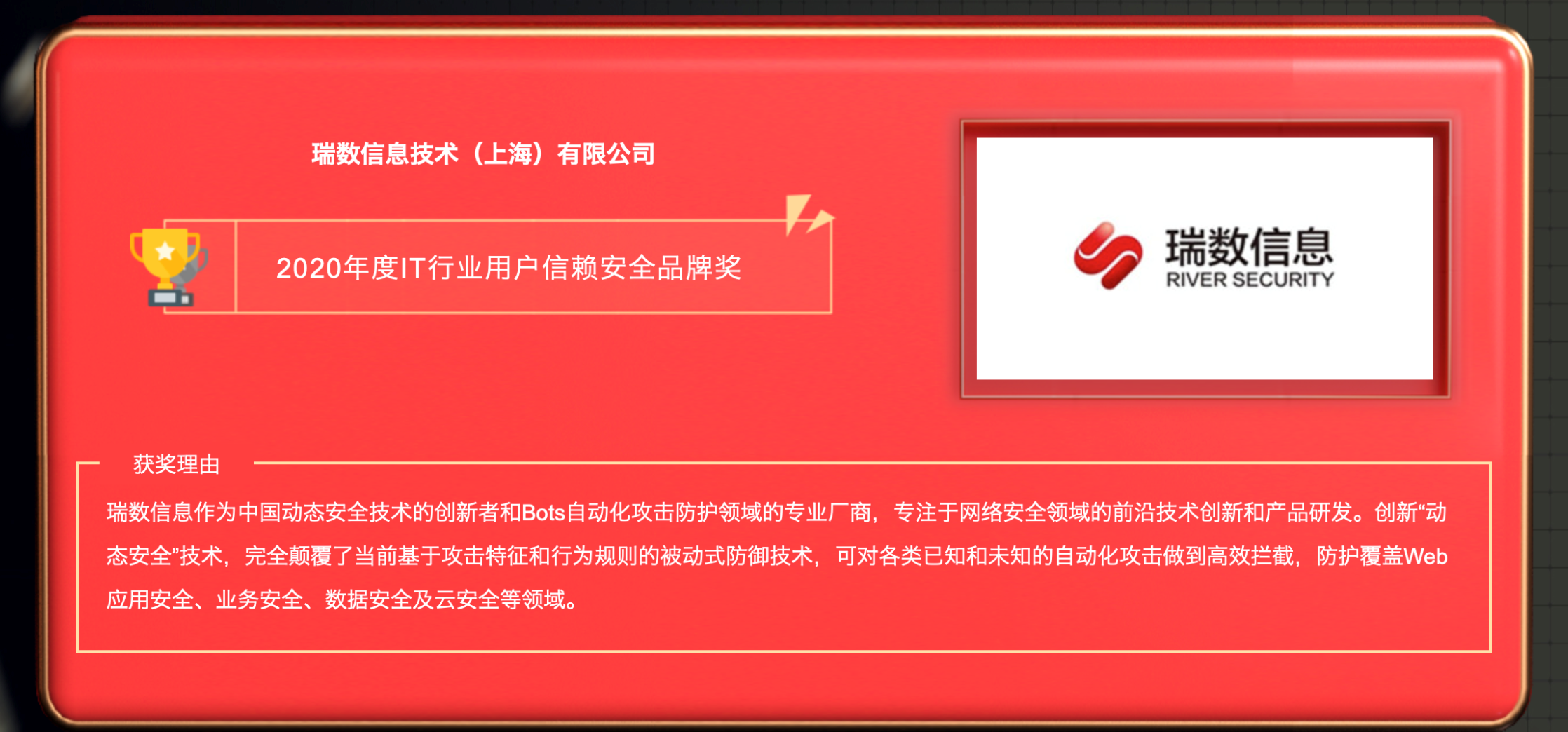 经评审,瑞数信息凭借强劲的动态安全技术实力和多年来积累的用户口碑,从百余家IT企业中脱颖而出,荣获“2020年度IT行业用户信赖安全品牌奖”!