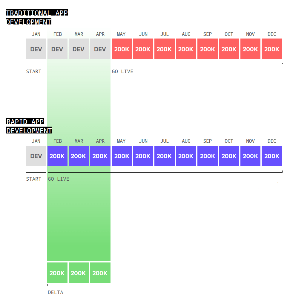 如下图所示,假设某应用每月可以带来20万的新收入。按照传统开发速度,可能需要四个月才能完成开发并投入使用。如果从1月开始开发,那么它将带来八个月的价值,即160万。