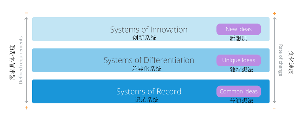 根据Gartner的速度分层(Pace-Layered)模型,企业应用环境由三个具有不同变化速度的层组成。变化速度取决于解决方案的独特性和需求的具体程度。