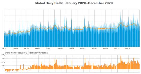 2021年3月11日,负责提供安全数字化体验的智能边缘平台阿卡迈技术公司(Akamai Technologies, Inc.,以下简称:Akamai)今天发布了报告《互联网安全状况报告:世界变幻莫测,我们灵活应对》(State of the Internet / Security report: Adapting to the Unpredictable)。该报告回顾了2020年的安全形势,分析了一些技术转变趋势和新兴模式——从年初与疫情隔离相关的互联网流量高峰,到由于更多的隔离和边境关闭以及假期等多方面因素而再次出现的流量高峰。