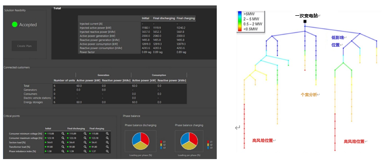 ● 步骤一:电网评估和长期目标预测。首先,电网公司需根据现有情况或利用预测数据根据未来发展情况对电网的承载能力进行分析。如下图所示,每当收到DER接入请求时,网络运营商通过承载分析工具可以非常清楚地看到连接可能性较高的位置(绿色部分及以上)、连接可能性较低的位置(黄色部分)以及不具有连接可能性的位置(红色部分),并评估DER在不同网络运行条件下会产生的影响。根据承载能力分析和目标预测审查的结果,网络运营商可以很好地了解现有网络及其余安全水平上限的相差幅度,并以此确定薄弱环节、关注重点以及应如何优化网络运行。