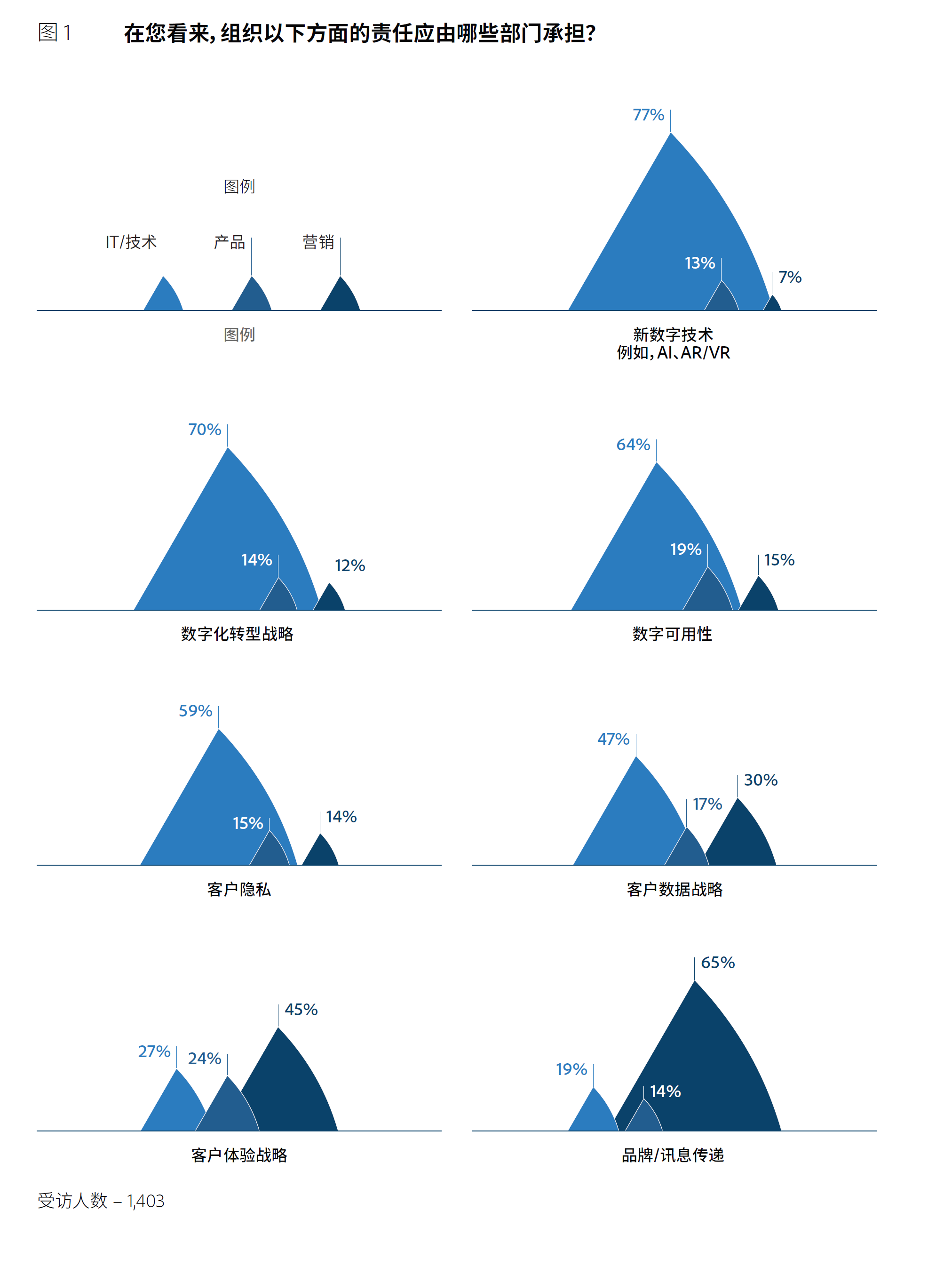在公司启动数字化转型的过程中,CIO及其团队已经走向用户体验项目的决策中心,担任起了改善甚至是重新定义客户体验的工作。无论是红极一时的AI、AR/VR等未来技术构建(77%),还是与企业整体战略相关的数字化转型战略(70%)和数字可用性(64%),或是与合规相关的客户隐私(59%)和数据战略(47%),IT部门都被认为是当仁不让的“先锋部队”。