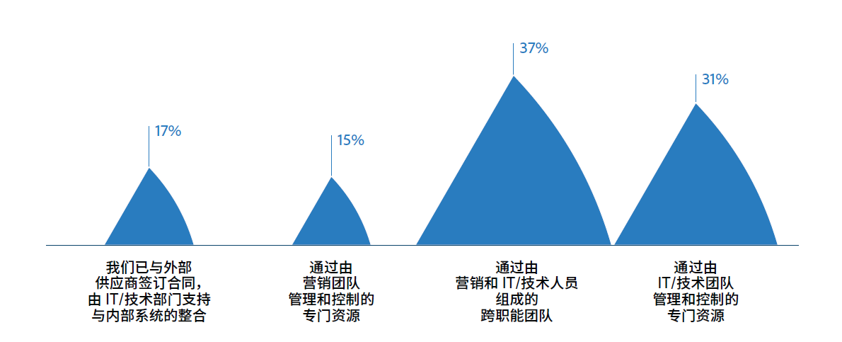 以客户体验为目标的数字化转型并非一帆风顺,依然会受到各类因素不同程度的掣肘。调研表明,当前企业主要通过CIO和CMO的紧密协作,由营销和IT技术人员组成的跨职能团队(37%)共同推进数字化,这样能够通过用户友好,易于集成的技术实现营销人员所需要的数字营销效果。