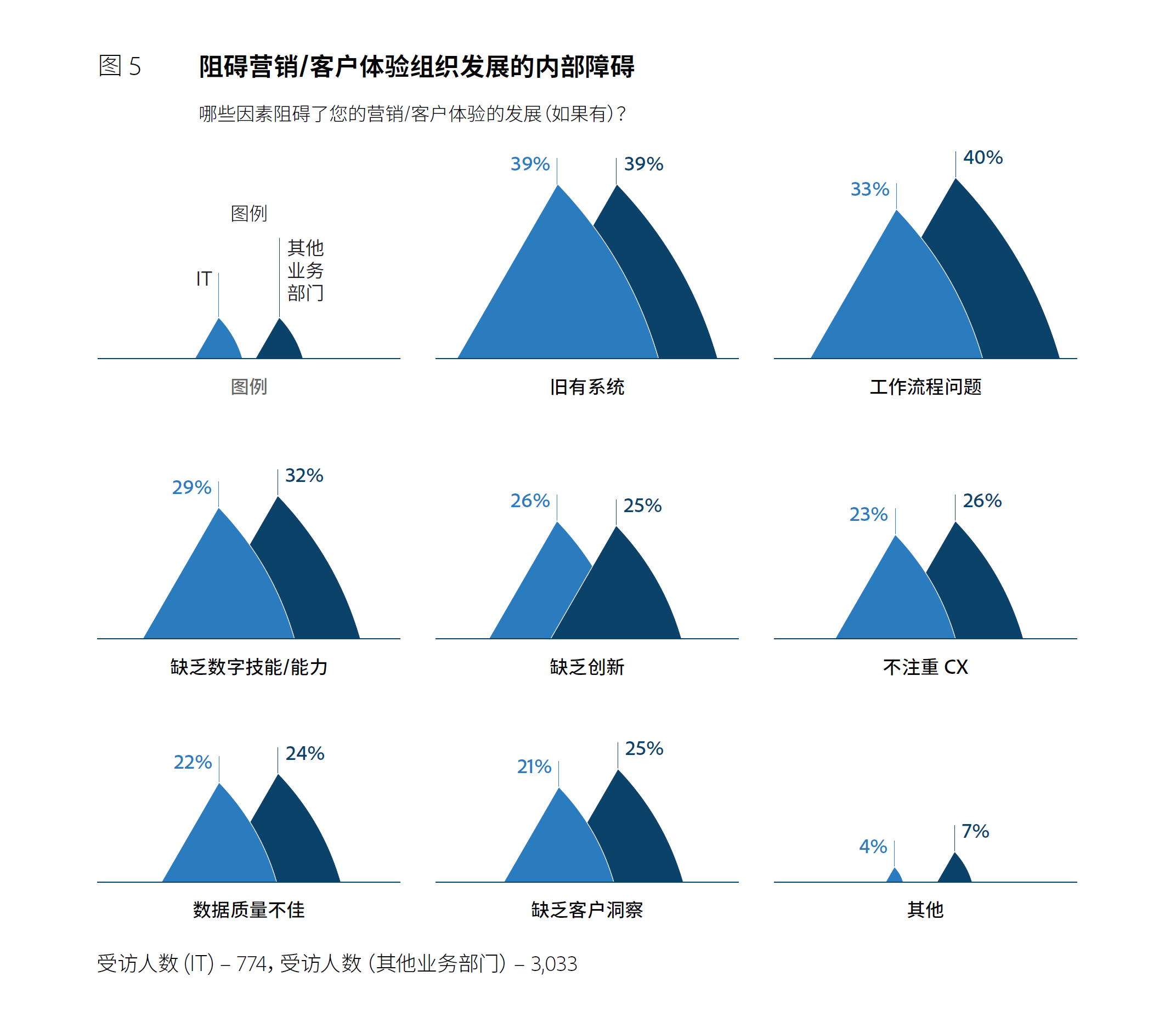 在这一过程中,旧系统和工作流程会产生许多不必要的摩擦,阻碍良好用户体验的实现。此外,IT部门与其他业务部门分别反馈了团队内均存在缺乏数字技能(29%和32%)、缺乏创新(26%和25%)、不重视用户体验(23%和26%)、数据质量不佳(22%和24%)以及缺乏客户洞察(21%和25%)等其他因素。旧系统还会带来数据质量差等问题,让企业无法通过对数据的分析充分了解到客户的旅程及其心态,这种洞察力的缺失将导致企业无法在旅程的关键互动点带来卓越的用户体验。