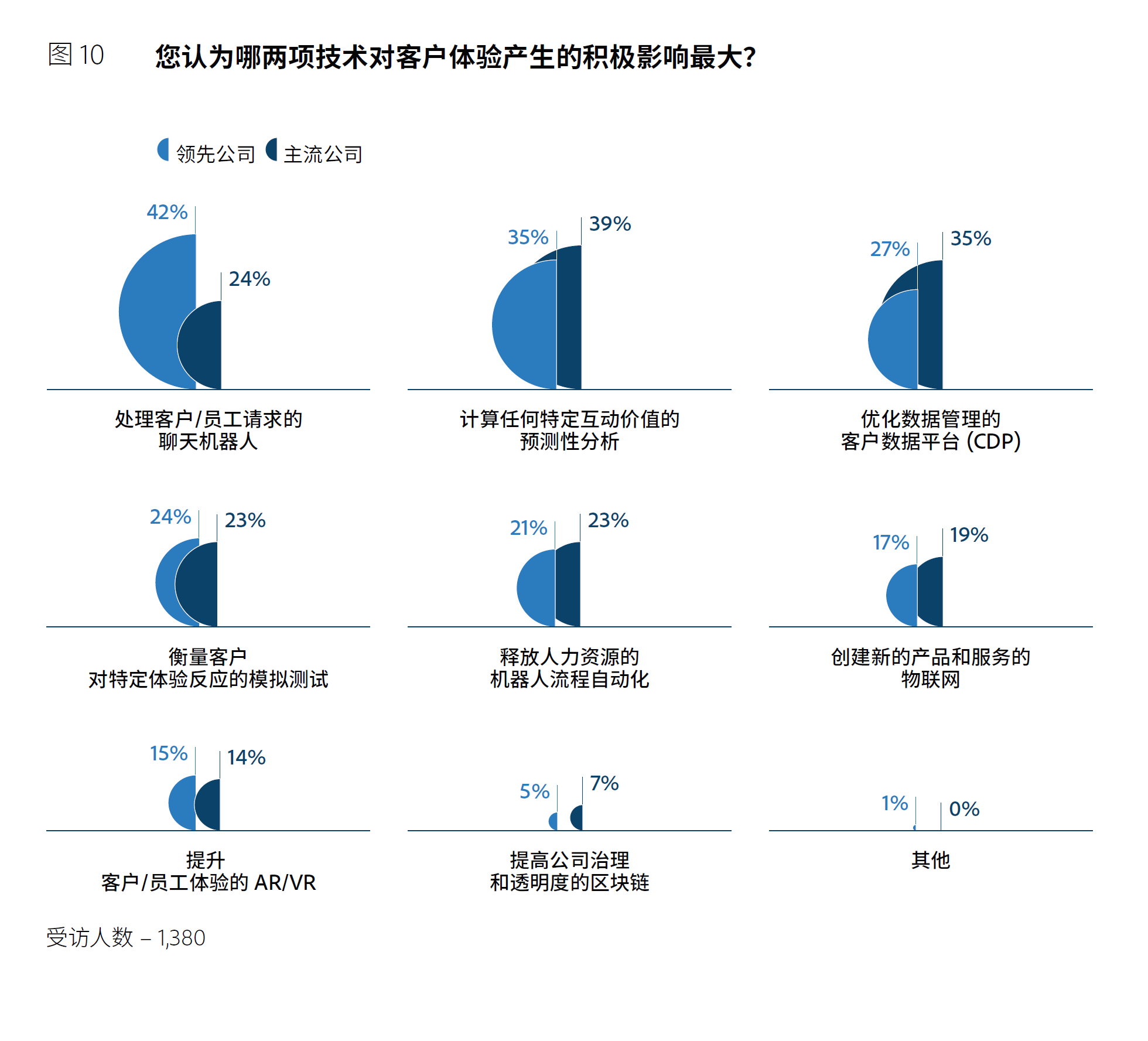 数字化素质较高的绩优公司几乎都已经做好了充分准备,迎接新的营销技术所带来的用户体验革新机会。其中被最广泛采用的一个例子(42%)是使用聊天机器人来处理客户或者是员工的请求。这种投资少,见效快且符合品牌特点的方式目前深得许多公司的青睐。