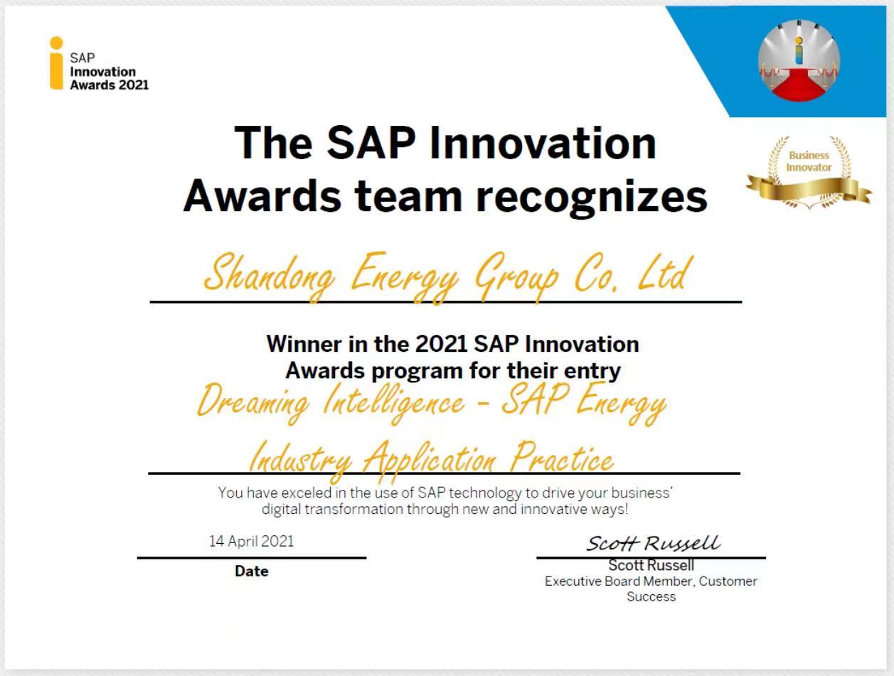 2021年4月27日, SAP宣布,中国领先能源企业、清洁能源供应商山东能源集团荣膺2021年SAP创新大奖(SAP Innovation Awards)。该奖旨在评选全球最具创新性、引领性的客户及合作伙伴,嘉许其通过科技应对复杂挑战的卓越能力。作为国内首家采用SAP S/4HANA数字化核心的能源企业,山东能源集团因积极推进全面数字化转型,颠覆传统生产和经营管理模式,引领行业创新式发展,获得该奖。