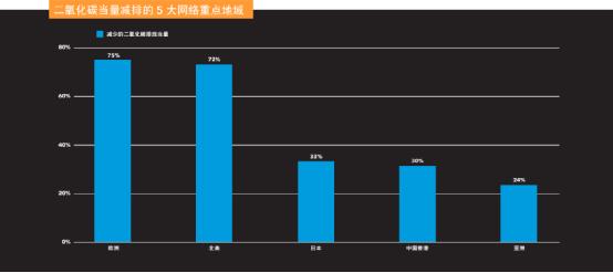 本公告是Akamai可持续发展计划的第二阶段。在2015年,Akamai就制定了如下目标:在2020年年底前,将我们的排放量减少30%,使可再生能源占到边缘平台所用能源中50%的比例,同时100%循环利用电子废弃物。在既定的五年期内,我们实现了所有这些目标。在这五年中,Akamai的智能边缘平台的可用容量增长了350%以上,但其单位容量的能耗则降低到2015年的十分之一。Akamai在亚洲二氧化碳排放量减少了24%,日本和中国香港地区分别减少了33%和30%(如下图所示)。