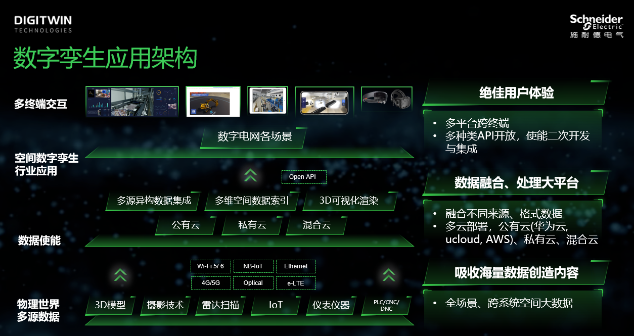 而打造以电网模型为基础、基于施耐德电气EcoStruxure三层架构的数字孪生平台,则可以有效解决这些挑战。在数字孪生应用架构的底层,可以通过智能设备、智能表计等手段广泛采集物理世界的多源数据,形成全场景、跨系统空间的大数据集;在中间层,则以公有云、私有云或混合云为平台,对不同来源、不同格式的数据进行融合和处理;最上层,则通过开放的API接口,让数据可以使能二次开发和集成,服务于数字电网的各个具体场景,营造多平台、跨终端的卓越用户体验。