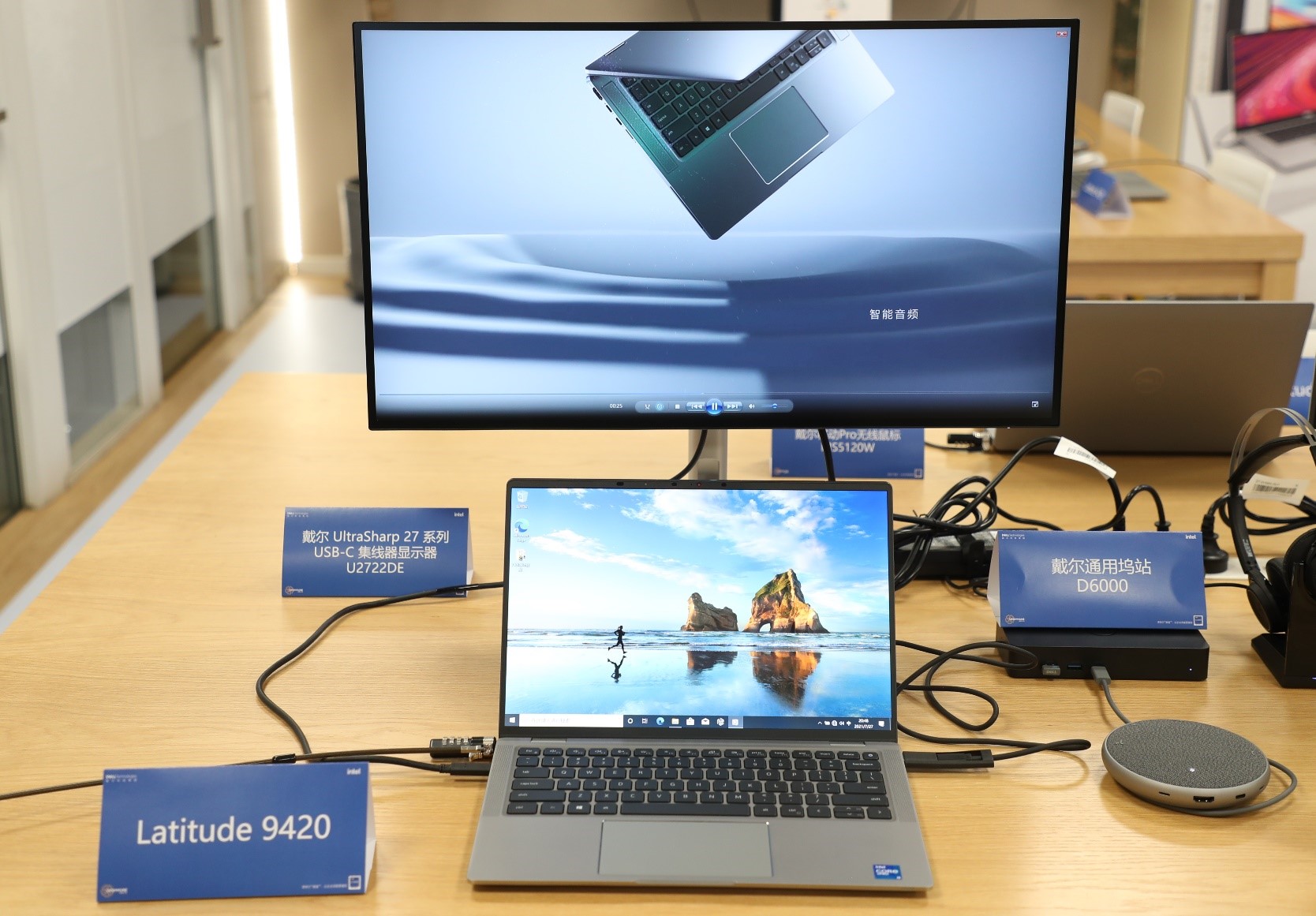 在会议场景中,配备了戴尔Latitude 3、5、7、9000不同系列的笔记本电脑,针对会议需求定制的戴尔55英寸4K会议显示器C5519Q、Apollo全指向麦克风扬声器,会议室中的员工借助这套设备,可与现场的团队和远程加入的同事们畅聊自己对新项目的构想。而居家办公体验区中,一台Latitude 7320二合一可翻转笔记本,搭配扩展坞WD19S即可有序连接34英寸的曲面会议显示器C3422WE、智能 4K 网络摄像头WB7022、无线耳机WL5022,即组成一套舒适的居家办公生态,用户居家办公也能享有大屏视野、畅快链接,沉浸式协作体验。
