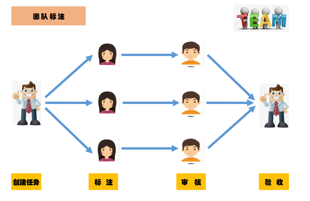 在多人标注中,共有三种角色:管理员、标注员、审核员。管理员创建多人标注任务,分配给指定的标注团队,标注员完成标注后,引入审核团队对标注员的工作进行审核,进一步提高了标注的准确率,保证了后续模型训练的标注准确性。审核员审核全部完成后,管理员对整体的标注效果进行验收,验收完成后标注工作正式结束。