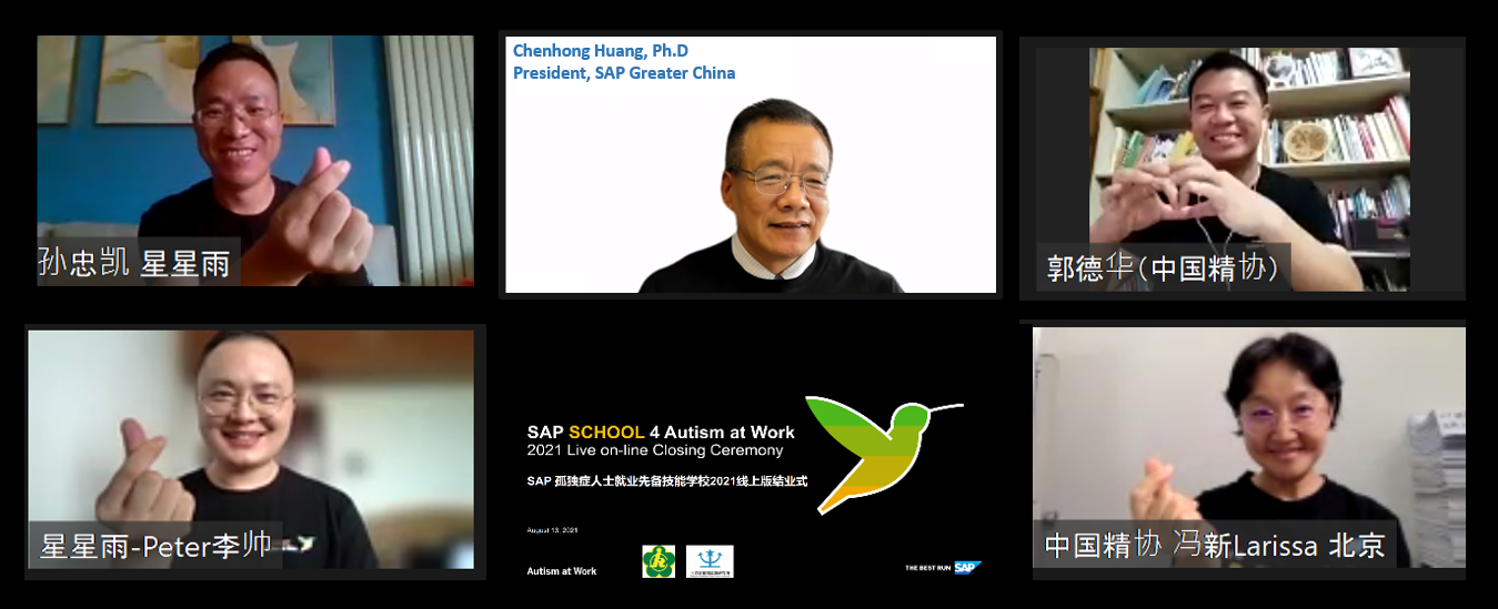 2021年8月13日, 今天,“SAP孤独症人才就业先备技能学校”第三期结业典礼在线举办。来自全国7个省份的18名孤独症学员,顺利完成了为期10天的线上培训课程,获得了由SAP、 中国精协和星星雨联合颁发的结业证书。部分学员代表在结业典礼上分享了学习成果、心得体会。