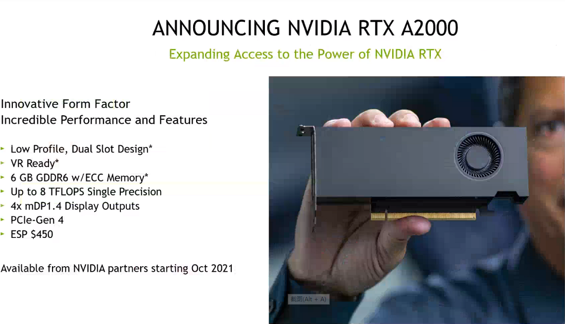 作为面向专业人士的高性能轻薄双路GPU,NVIDIA RTX A2000结合了最新一代RT Core、Tensor Core和CUDA Core与6GB ECC显存于一身,专为日常工作流程而设计,专业人士可以开发逼真的渲染、构建精确的物理模拟并使用AI加速工具。