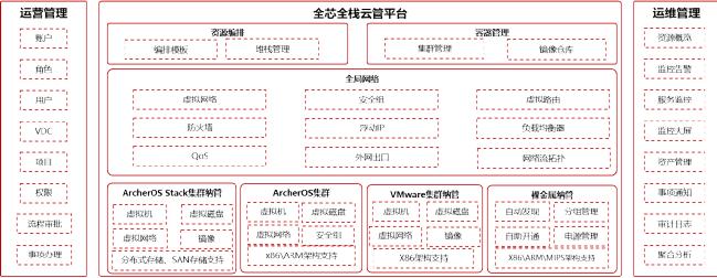 安超云基座一站式解决方案是由安超云套件系列产品Archer CloudSuite共同构成,同时组件可拆,每个组件均可独立服务,方案可以兼容不同x86、ARM、自主创新芯片的硬件与操作系统,适应不同阶段IT云化服务。并在集团信创基地群的生态做以大量兼容、稳定性适配,屏蔽底层基础设施差异,能为客户适配提供完整信创云方案。其中组件包括: