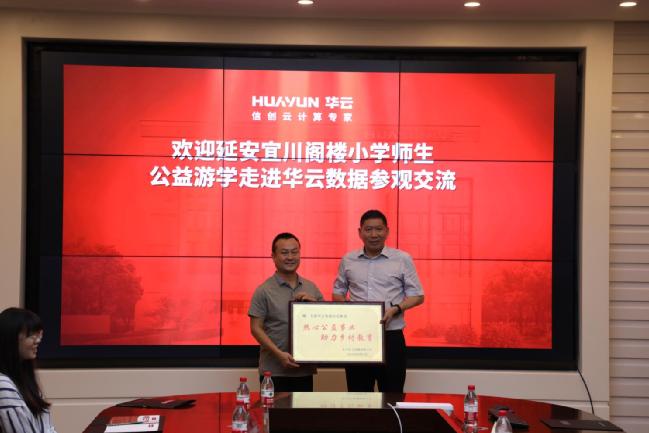 华云数据高级副总裁张华林(右)接受阁楼小学爱心授牌