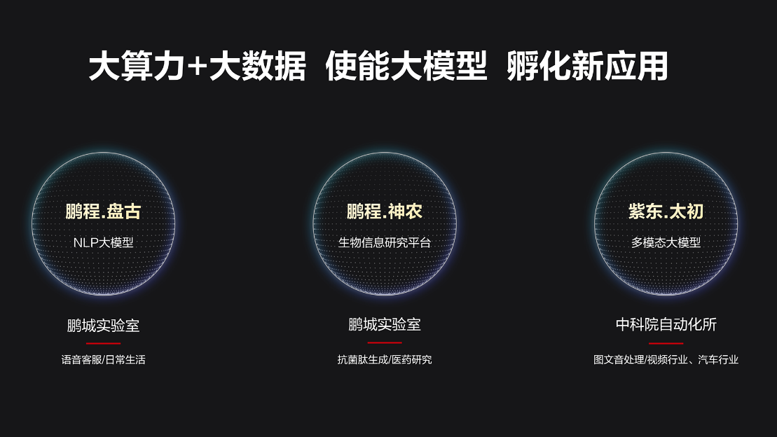 人工智能算力网络汇聚的大算力与大数据使能大模型的训练,从而孵化新应用,推动人工智能产业发展。中科院自动化所、鹏城实验室分别发布利用人工智能计算中心训练的多模态大模型紫东.太初、生物信息研究平台鹏程.神农。紫东.太初是业界首个三模态大模型,能够实现视觉、文本、语音三个模态间的高效协同,性能全球领先的图文音跨模态理解与生成能力,可轻松完成智能问答、图片生成、视频理解与生成等任务,将在工业质检、影视创作、互联网推荐、智能驾驶等领域广泛应用;鹏程.神农生物信息研究平台,包含蛋白质结构预测、小分子生成、靶点与小分子相互作用预测以及新抗菌多肽设计与效果评价等,制药企业和医学研究机构使用鹏程.神农提供的AI能力,将大大加速新型药物的筛选与创制。此外,鹏城实验室、武汉大学会继续推出基于昇腾AI的更多大模型,未来这些大模型将面向全球开源,可通过访问昇腾社区(hiascend.com)获取。