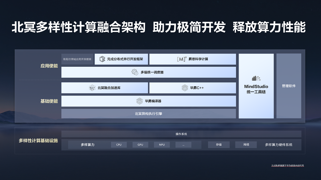 基础使能:提供通用、高效、高性能的开发基础工具,其中毕昇C++语言支持多样算力、可实现单一源码的跨算力统一编程;毕昇编译器支持多样算力统一编译和融合编译优化;北冥融合加速库拥有统一API接口、具备多算力协同能力。