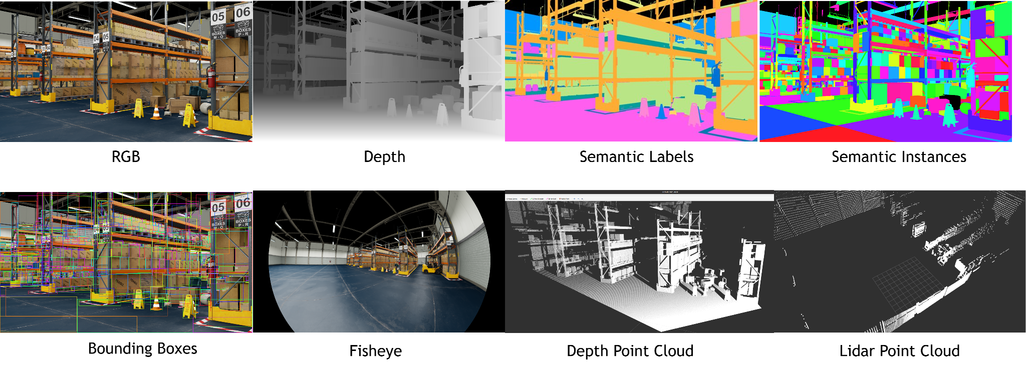 图3. Isaac Sim中传感器库的合成数据实例。