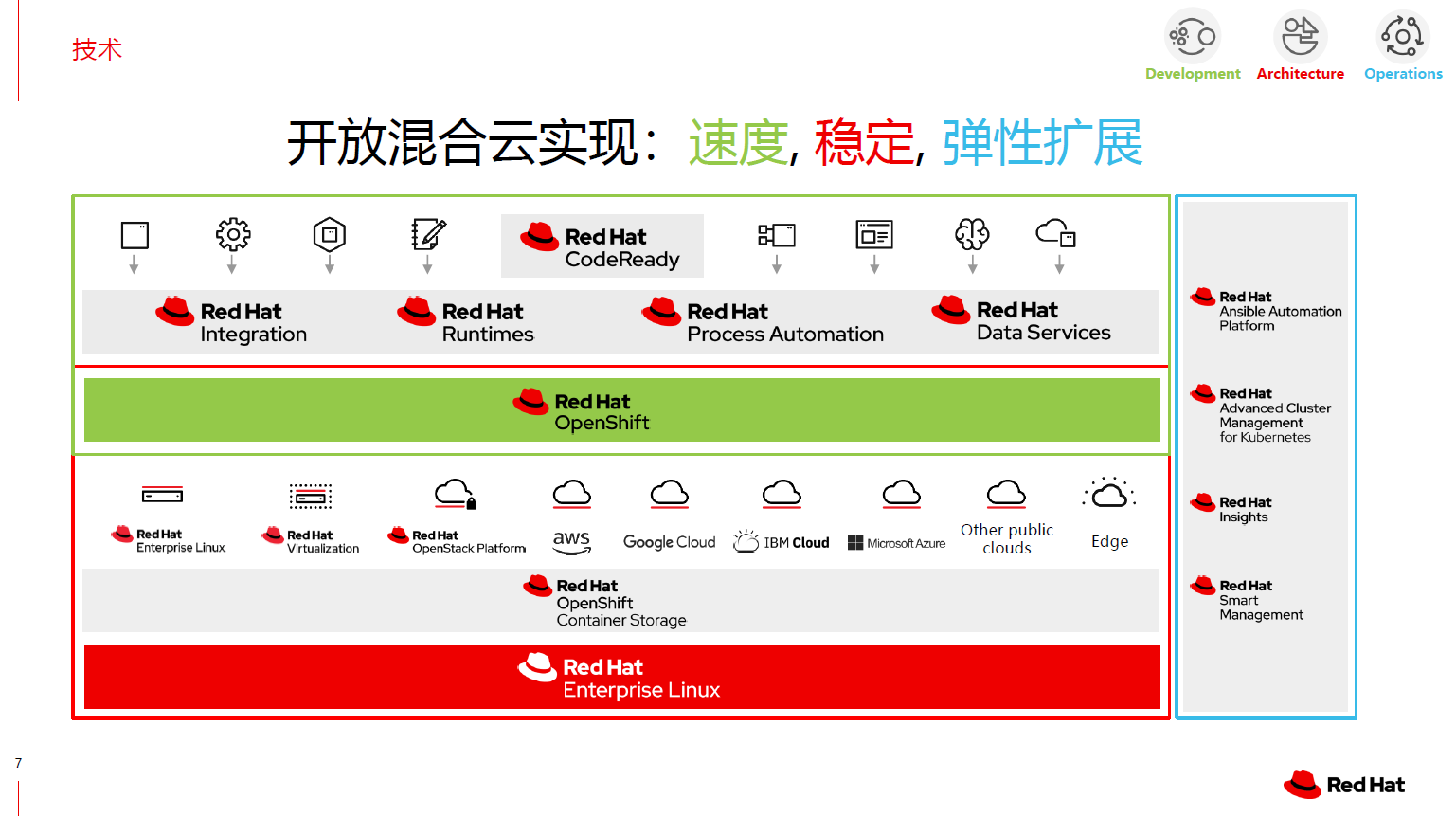 事实上,这三大要素与过去红帽在技术领域所持价值主张一致。特别是几年前在开放混合云战略推进时,与红帽致力于满足客户需求的三个技术能力相吻合,也即“三个S”:稳定(Stability)、弹性扩展(Scaling)和速度(Speed)。