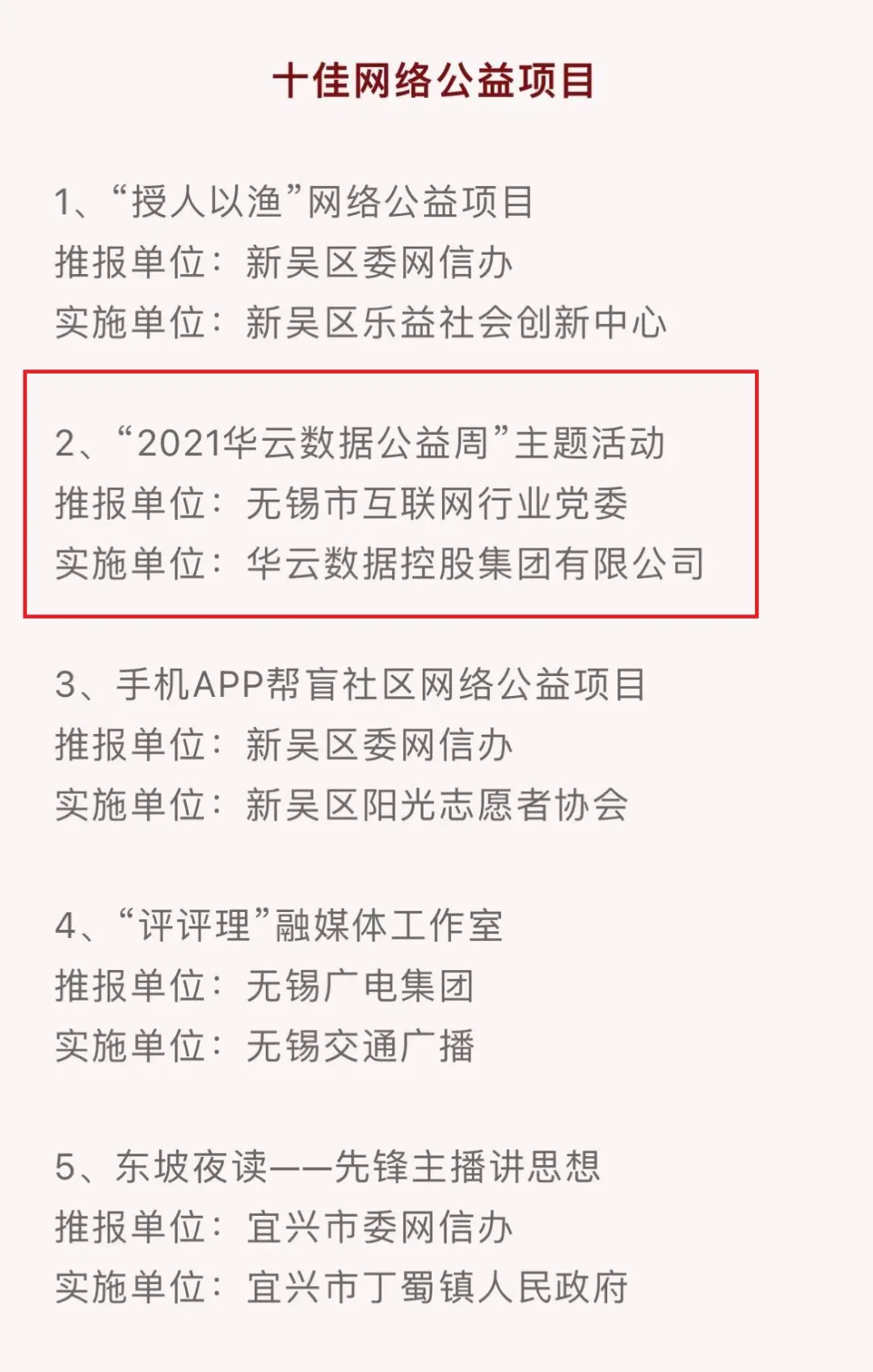 “华云数据公益周”被评为“无锡市十佳网络公益项目”
