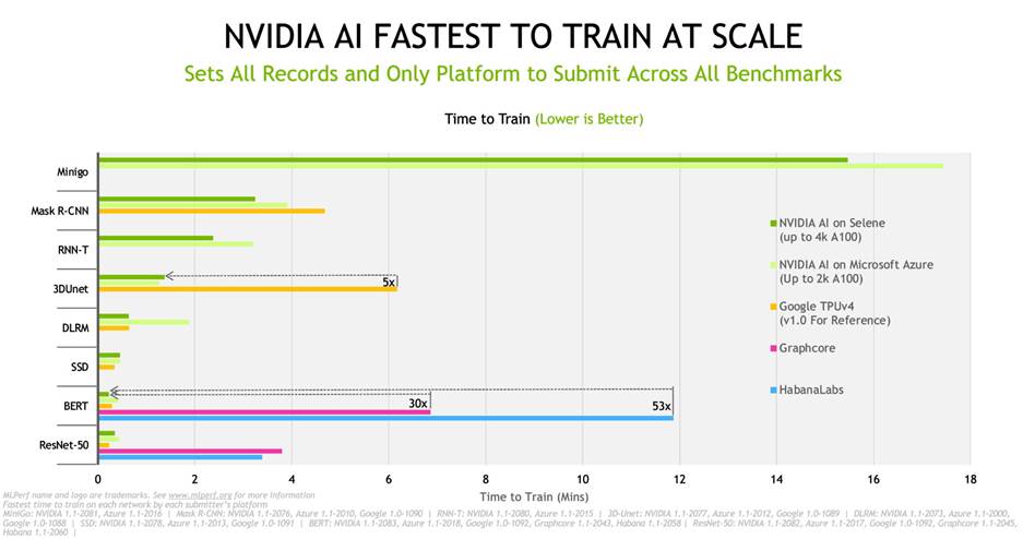 图示:在新一轮的测试中,NVIDIA AI训练所有模型的速度都快于替代方案。