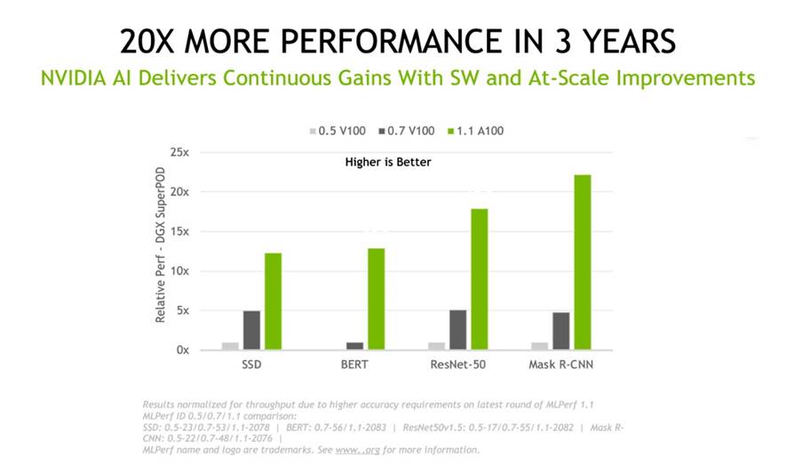 图示:NVIDIA AI在三年内实现了20倍以上的改进。