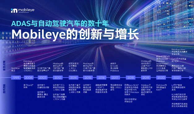 作为行业领导者之一,Mobileye始终处于高级驾驶辅助系统(ADAS)和自动驾驶解决方案创新的前沿,这是一个快速增长且不断演进的市场,并正在改变全球的货物运输和人们的出行方式。2021年,Mobileye EyeQ® 系统集成芯片(SoC)出货量突破1亿片,Mobileye的自动驾驶测试汽车已在位于美国、欧洲和亚洲的全球多座城市开跑,Mobileye还推出了量产自动驾驶出租车,赢得了全球超过30家汽车厂商的41款车型的全新ADAS项目订单,这些项目涵盖了从核心的驾驶辅助技术到下一代驾驶辅助和完全自动驾驶系统。Mobileye还赢得了从2023年开始的多个出行即服务(MaaS)项目,以及从2024年开始的多个采用Mobileye自动驾驶系统的消费者和B2B量产汽车项目。