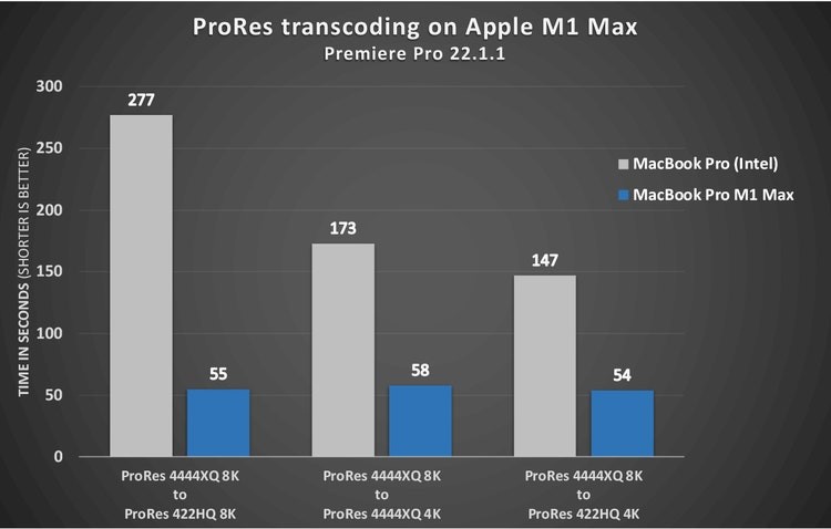图二:Apple M1 Pro 和 M1 Max 系统的新硬件加速功能可将 4K 和 8K ProRes 格式性能提升高达五倍