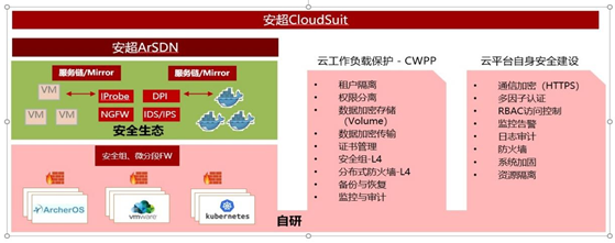 利用SDN能力,安超云平台又引入了安全生态,在安超云产品中可以自由选择合作的安全厂商的各类安全方案,如主机安全、网络安全以及容器安全等。其中,网络安全和众多国内领先的安全厂商完成合作,为产品提供了下一代防火墙、网页应用防火墙、网络审计、数据库审计等功能。这类安全功能不仅支持信创平台,还支持和传统平台混用一套安全方案,在更好的支持用户过渡至信创平台的同时,还为用户降低了40%的迁移时间。